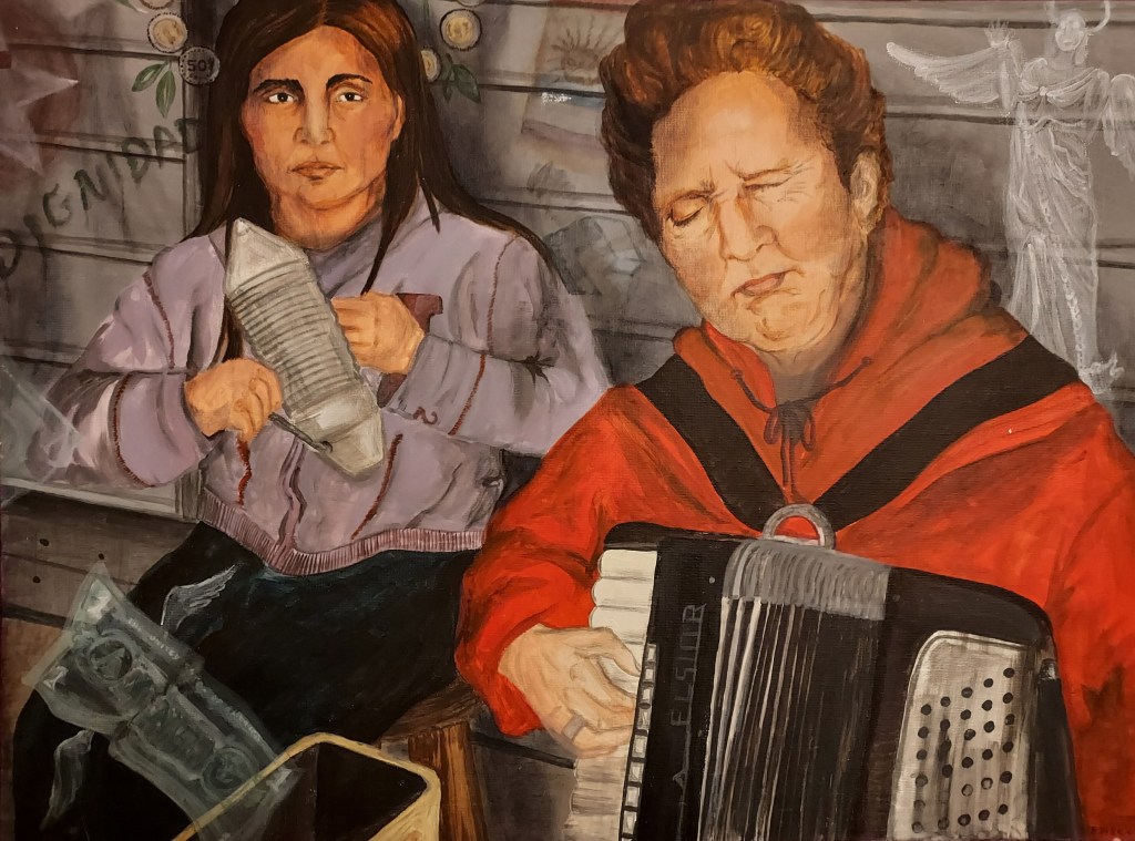 When I visited Chiapas, the Zapatista movement was in full force decrying the North American Free Trade Agreement. Small hand-crafted dolls of Zapatista riders in all shapes and sizes were sold by small children at tourist spots. They were the stuff of reality – and dreams – of an indigenous- centered vision seeking to lift all citizens and their natural world. I painted some composites of the many children I met in Chiapas with the full moon over them and the Zapatista rider-dolls in their child-dream-space as they stood against a blood-red sky (below left).