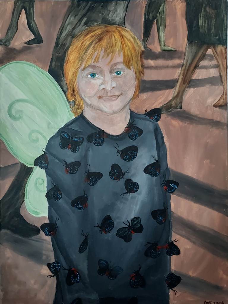 This was inspired by over a decade of citizen protests to protect Miami’s imperiled Pine Rockland habitats from development. When I was in graduate school in Miami, I studied and worked on the preservation of the Atala butterfly. This butterfly nearly went extinct in south Florida as its native food plant and its larger habitat were exploited by humans. Through native plants and some rogue conservation by area naturalists and backyard gardeners, the butterfly survived. And thanks to protesters, at least some Pine Rocklands are safe – for now. The butterflies on the boy are the magical Atala who are slow-flying and can sometimes be caught by hand. They have glittery blue-black wings and aposematic coloring – red on their abdomens and wings, alerting predators to their toxicity. They are truly magical survivors and tangible examples that we humans can devastate – but if we choose, we can also preserve.