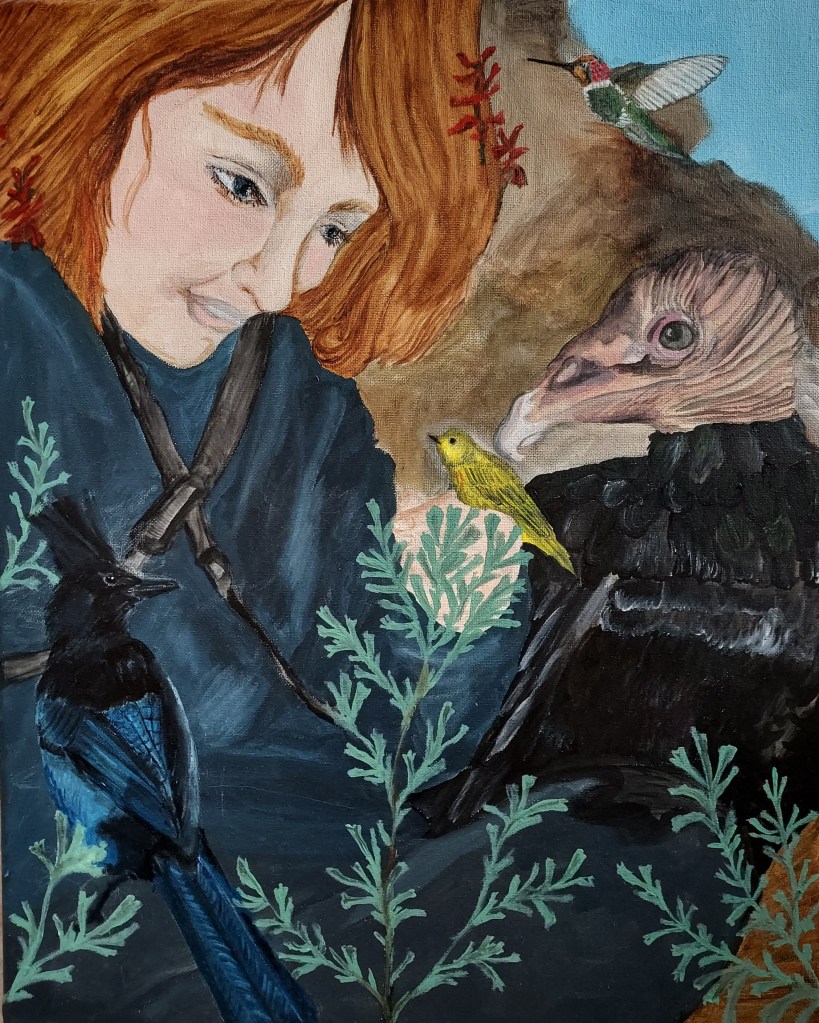 I find myself constantly adapting my painting subjects to where I am. My take on magical realism in the cold desert includes a vulture, Stellar’s jay, Anna’s hummingbird and a yellow warbler. All creatures that frequent Northern Nevada. The birds are curious about the child and the child about the birds. I wanted to embody the way everything gets silent and wonderous – almost otherworldly- when we meet a wild creature in its own habitat, on its own terms. We are all that child again.