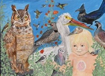 This painting pairs a defiant Florida Scrub Jay whose scrub habitat is critically threatened by development and greed with a striking child who represents wonder, delight in the magic of nature, and hope…